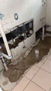 A bathroom drain line inspection after signs of slab leak and sewer failure in Orlando, FL. Access was created by opening the tile wall and breaking the concrete slab to expose damaged drain and sewer piping. Existing lines showed deterioration and failure at multiple connection points, causing leakage beneath the slab. Excavation completed to fully expose affected piping system. Old drain lines removed and prepared for replacement with new PVC piping to restore proper flow and prevent future backups. Area cleared for proper re-piping and reconnection to main sewer line. This is a full drain line repair involving slab access, pipe replacement, and system restoration to eliminate underground leaks and structural risk.